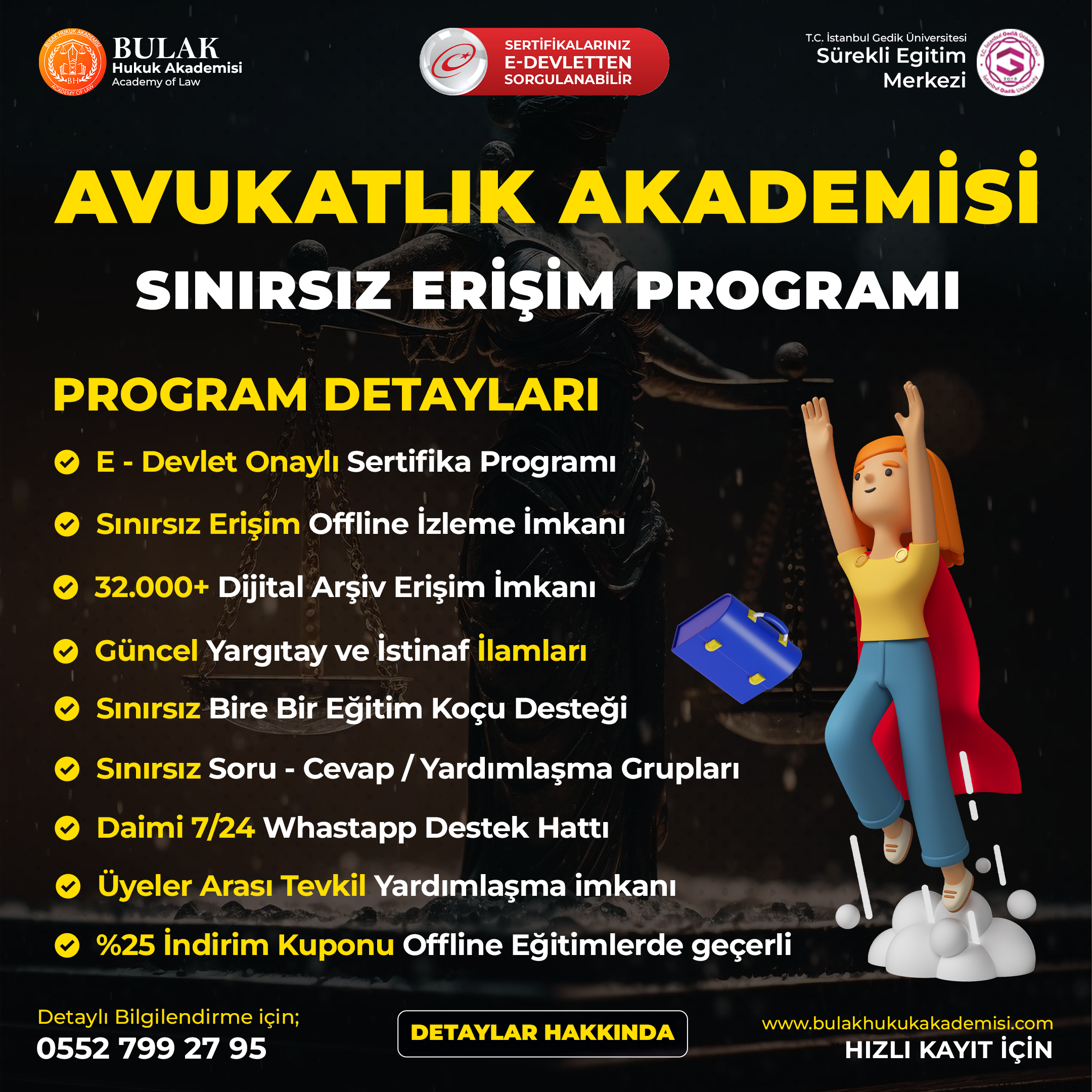Mesleki bilgi ve becerilerinizi güncel tutmak ve ileriye taşımak için tasarlanan uzmanlık eğitimlerimizle saha da uygulamaya dair bir adım önde olun. Ceza hukuku, İcra Hukuku, İdare Hukuku , Vergi Hukuku ve diğer hukuki alanlarda uygulamaya yönelik derslerle donanımınızı artırın. Sınırsız Arşiv ve VIP WhatsApp grupları ile destek sağlanmaktadır.