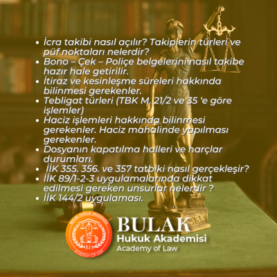 Bulak Hukuk Akademisi olarak, avukatlar, hukuk öğrencileri ve stajyer avukatlara yönelik yüksek kalitede eğitim ve eğitim hizmetleri sunmaktayız. Misyonumuz, hukuk camiasını gerek online gerekse offline öğrenme olanaklarıyla bilgi ve becerilerle donatarak mesleki başarılarına katkı sağlamaktır.